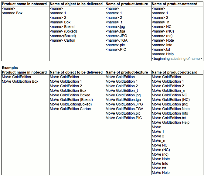 For most easy setup its recommended to choose the names for product-objects, product-texture and product-information-notecard like this:
